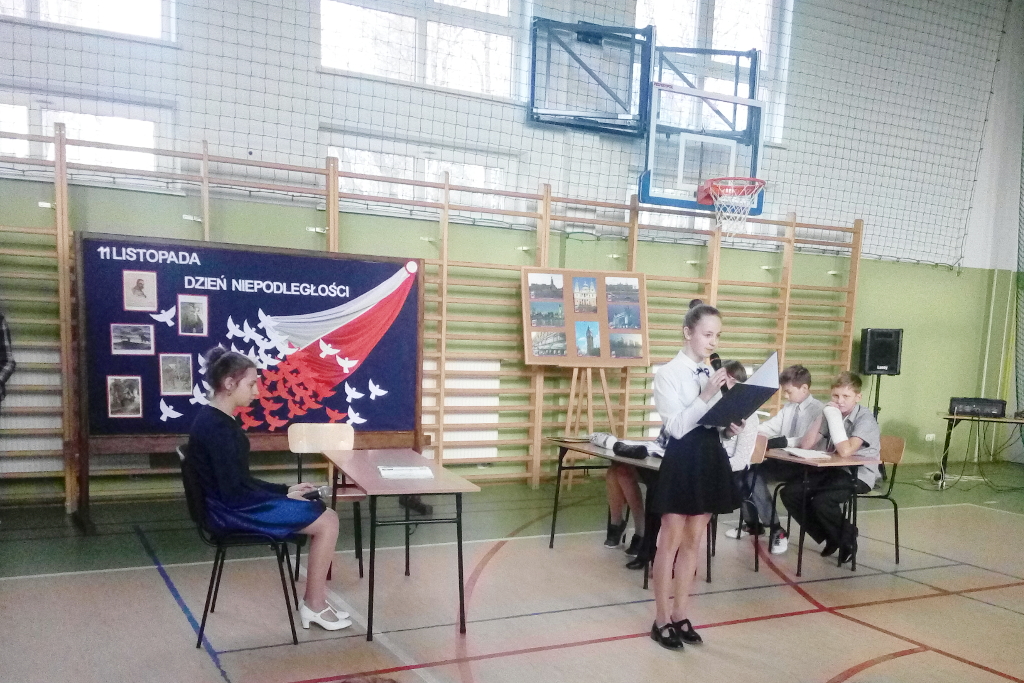 9 listopada 2017r. nasza szkoła radośnie świętowała Dzień Niepodległości. 99 rocznia odzyskania niepodległości została upamiętniona występem artystycznym. Młodzież z kl. VI, VII szkoły podstawowej i III gimnazjum, pod kierunkiem Marii Kuczkowskiej-Durlak, Lidii Domagały i Marka Rudy, wspaniale zaprezentowała swoją postawę patriotyczną w montażu słowno-muzycznym, do którego wykorzystano opowiadanie Marii Dąbrowskiej "Marcin Kozera" oraz wiersze i pieśni patriotyczne.