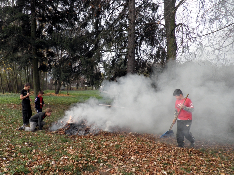 Jesienią 2013 r. uczniowie klasy V wzięli udział w 7 ogólnopolskiej akcji grabienia liści kasztanowców zorganizowanej przez Fundację ,,Nasza Ziemia” we współpracy z Kancelarią Prezydenta RP oraz Lasami Państwowymi. 24 października uczniowie wraz z opiekunem – L. Popadziuk wyposażeni w rękawice, worki i grabie rozpoczęli działania zmierzające do niszczenia liści kasztanowca zarażonego szrotówkiem kasztanowcowiaczkiem. Bardzo dokładnie zgrabili opadłe liście w ilości 6 worków, przenieśli w miejsce, w którym zgodnie z zasadami bezpieczeństwa zostały spalone. Do zainicjowanych działań włączyli się również Rodzice uczniów, którzy utylizowali liście kasztanowców znajdujących się na ich lub w sąsiedztwie prywatnych posesji.